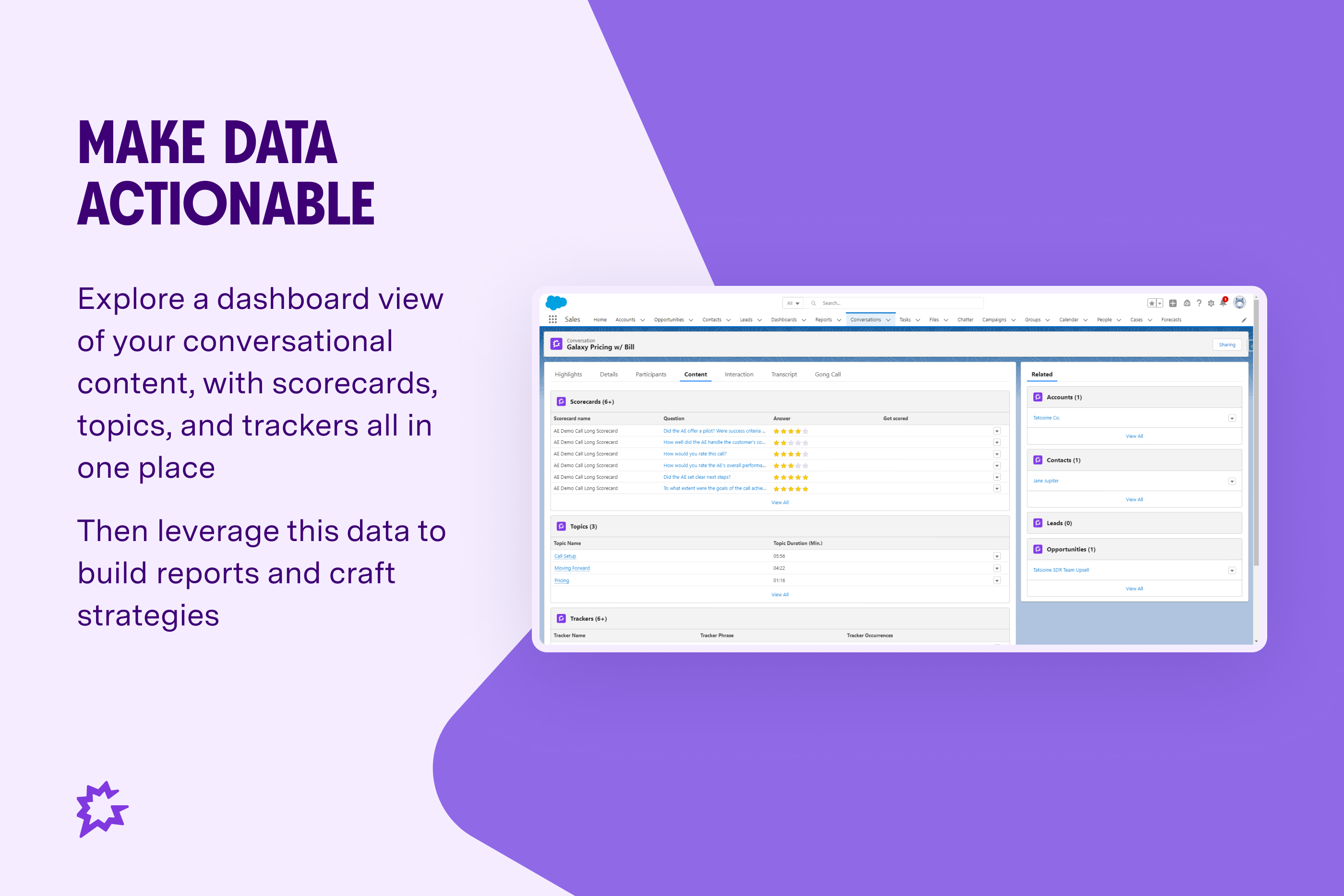 Enrich your data in Salesforce with Gongs conversation data to get the insights you need to make better decisions and close more deals. Gong is the 1 revenue intelligence platform for B2B sales teams. Gong for Salesforce uses a single API call to create a new Gong Conversation record which creates approximately 25.